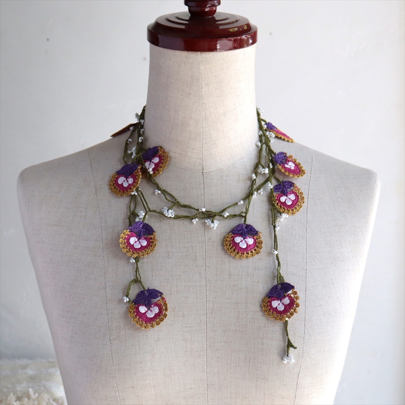 トルコの伝統的な手芸「オヤ」をモチーフにして、手編みで作られたネックレスです。このピースは、かぎ針で編んだ「トゥ・オヤ」。
