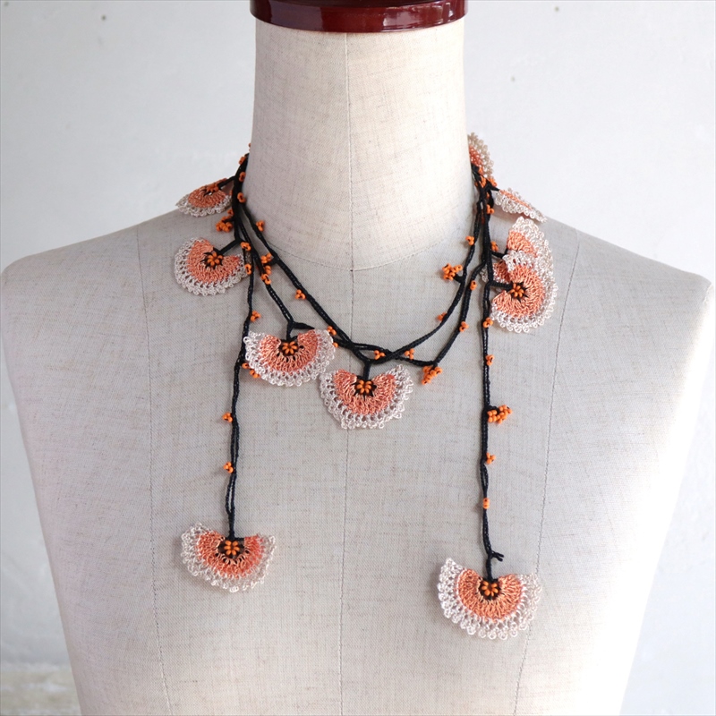 トルコの伝統的な手芸「オヤ」をモチーフにして、手編みで作られたネックレスです。このピースは、かぎ針で編んだ「トゥ・オヤ」。