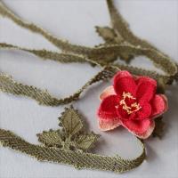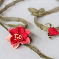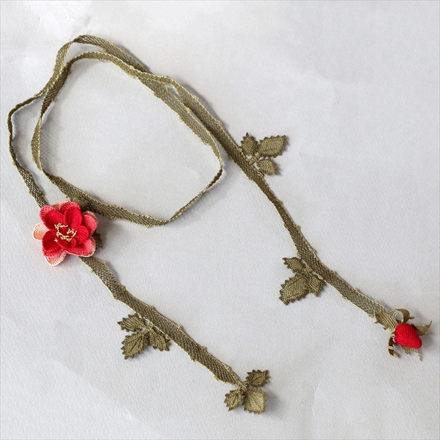 イーネ・オヤとは、トルコの女性たちが頭髪を隠すために身に着けていたスカーフの縁飾りのこと。レース編みのように見えますが、かぎ針のレースではなく、刺繍針を使い結び目を作りながら作ってゆきます。立体的な花の細工は珍しく、トルコ女性たちの細かな手仕事の技術は世界でも注目されています。