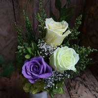 バラ、カスミ草、ソフトストーベ、ツリーファーン、アジサイ、ヘデラ、ベアグラス