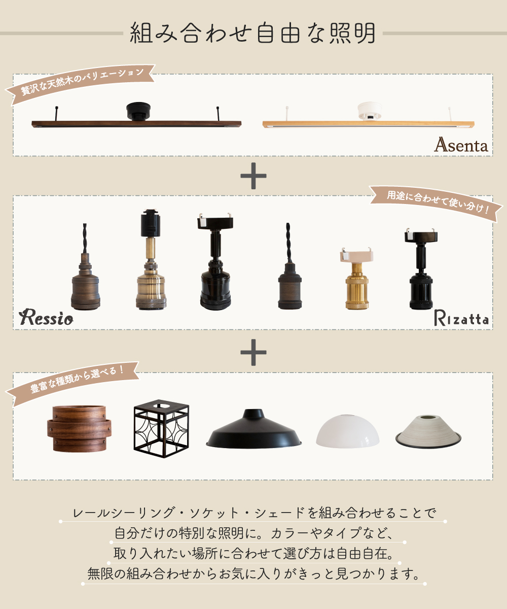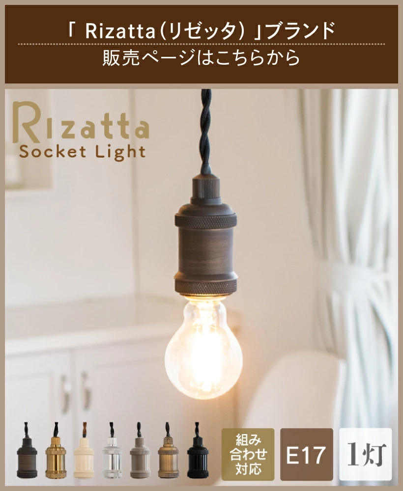 専用ソケットRizatta(リゼッタ)シリーズと組み合わせることで、ペンダントライト・シーリングライトとして、コンセントタイプにパーツ(別売)を加えてブラケットライト・デスクライトとしても、様々なシーンでご使用いただけます。
