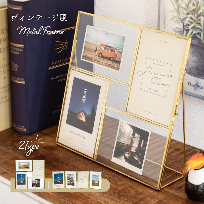 フォトフレーム インテリアフレーム おしゃれ L判 ポストカード ハガキ 卓上 シンプル ゴールド ガラス メタル 正方形 ドライフラワー ヴィンテージ 4枚