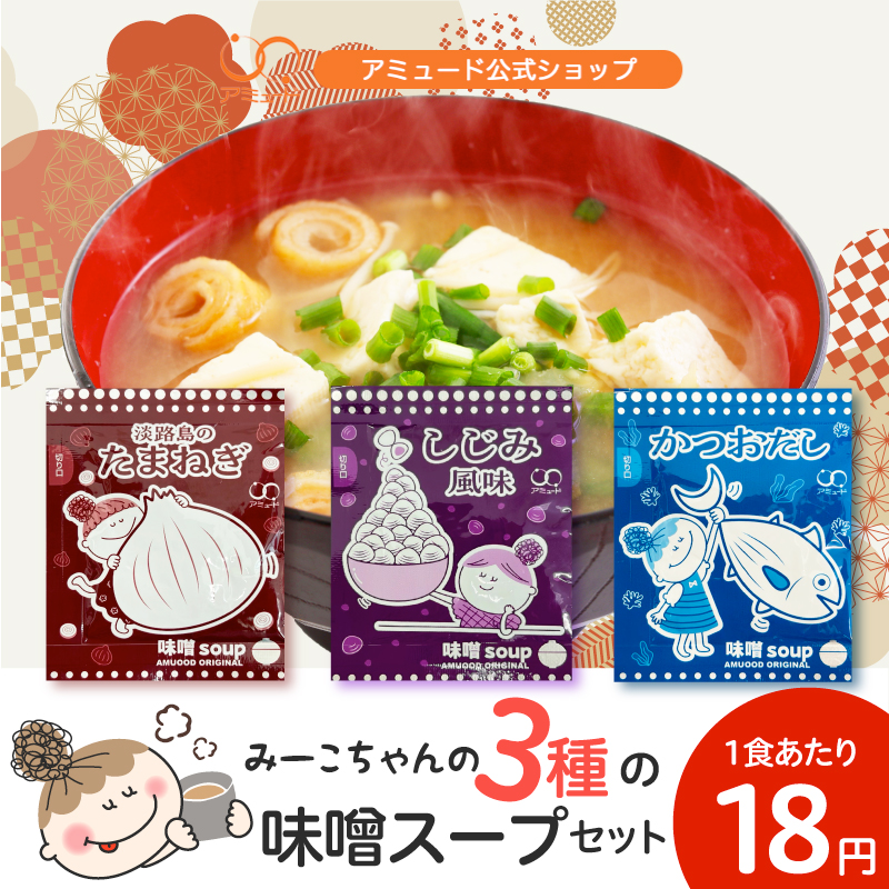 | 原材料 | 淡路島産たまねぎ味噌スープ 粉末みそ(国内製造)、食塩、玉ねぎ粉末、砂糖、わかめ/調味料(アミノ酸等)、(一部に大豆を含む) かつお味噌スープ 粉末みそ(国内製造)、食塩、かつお節粉末、わかめ/調味料(アミノ酸等)、(一部に大豆を含む) しじみ風味味噌スープ 粉末みそ(国内製造)、食塩、わかめ/調味料(アミノ酸等)、香料、(一部に大豆を含む) |