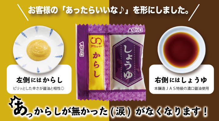 | 詳細 | しょうゆとからしを便利なWパックにしました。 |