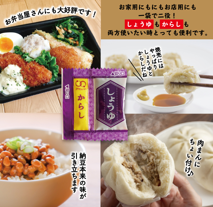 | 使用方法 | 焼売やお弁当、納豆や肉まんのちょいづけなど、しょうゆとからし両方使いたい時に便利です! |