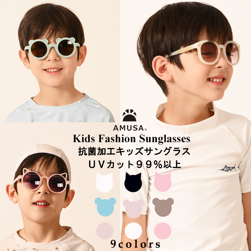 AMUSAのブランドロゴがポイントのキッズ用ファッション・サングラスです。99%のUVカットが期待できますので、野外遊びの際、お子様の大切な目を優しく保護できます。デザインは、ねこちゃんタイプ、くまさんタイプ、ボストン・タイプの3種類。カラーは各3色で、全9種類。