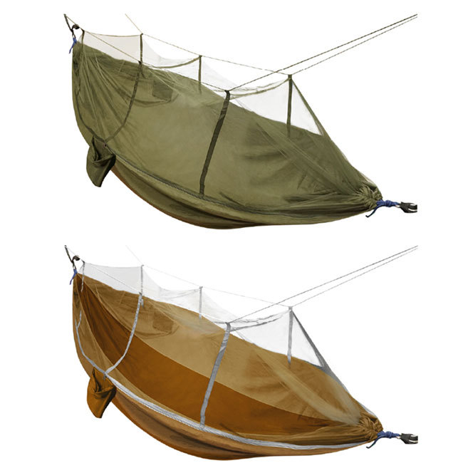 仕様:蚊帳付きで虫の侵入を防ぐハンモックです。蚊帳はメッシュネット式なので通気性がよく風通しが抜群。ダブルファスナーで外側からでも内側からでも開閉できます。ポケットにハンモックをまとめると、そのまま収納バッグになるので携帯性が抜群。蚊や羽虫の多いキャンプシーズンで快適にハンモックを楽しめます。