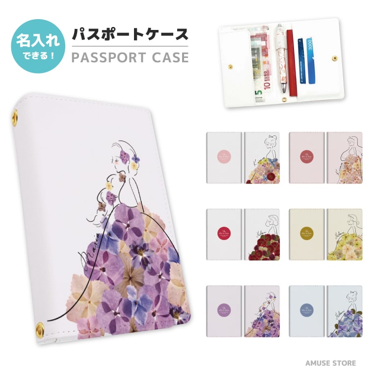 名入れ パスポートケース おしゃれ かわいい 2つ折り カード 紛失防止 ストラップホール付 高級感 軽量 プリンセス 押し花 花柄