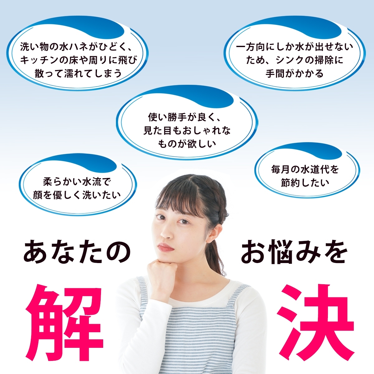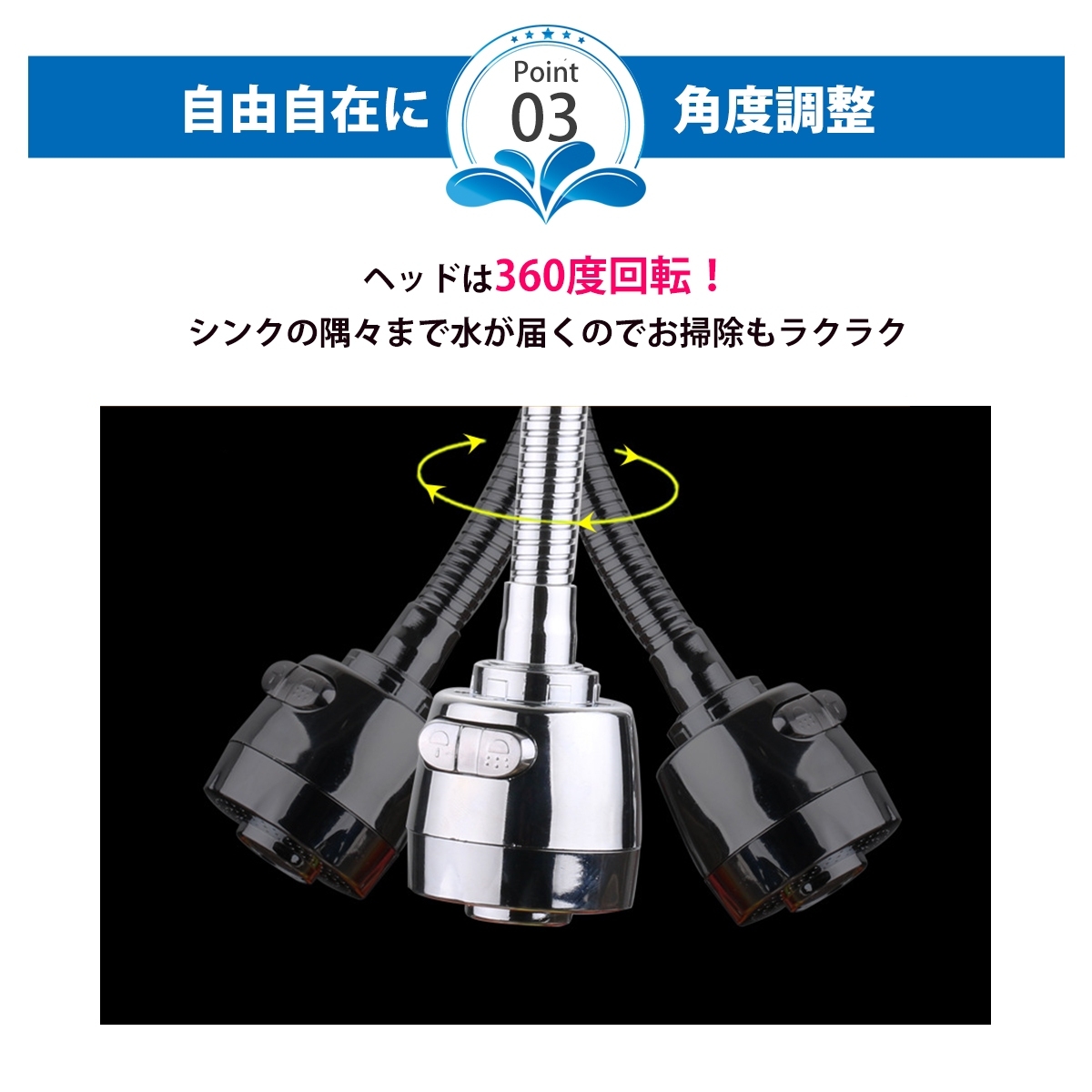 360°自由自在に角度調整できるので、従来の蛇口では届きにくかったシンクの端までしっかりと水が届きます。