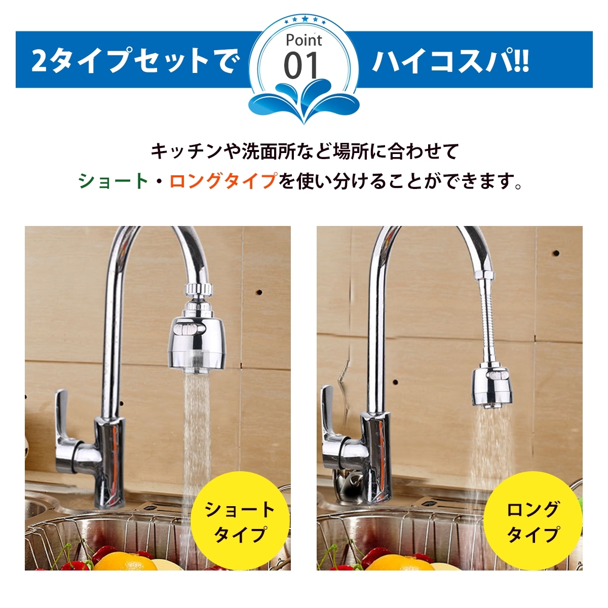 蛇口の位置が高いキッチンなどに最適。