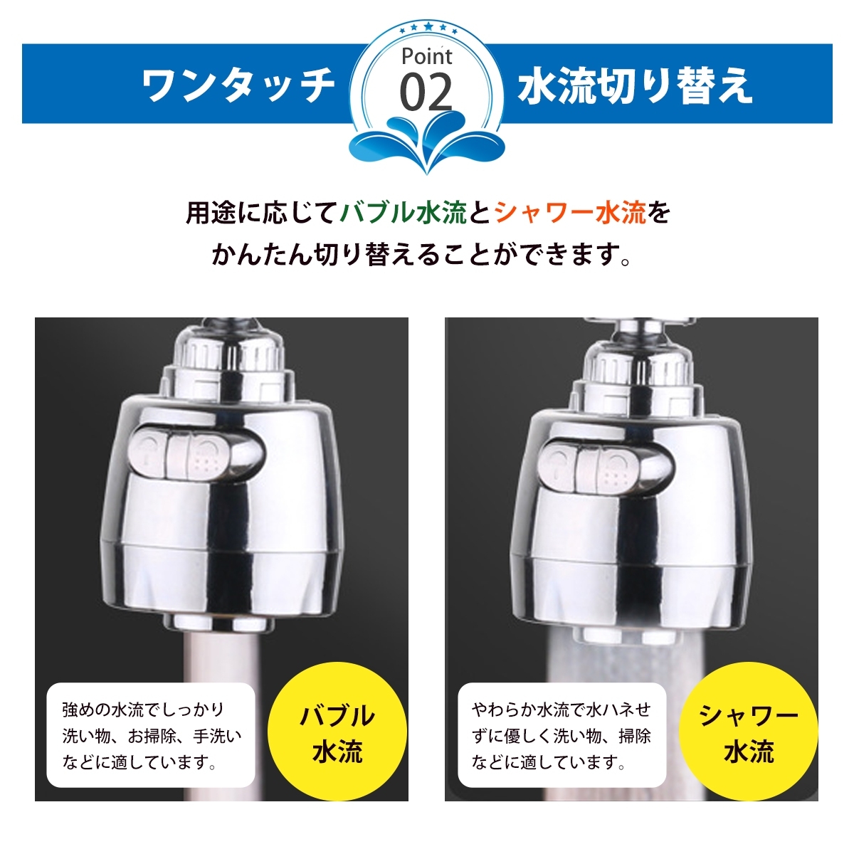 強めの水流でしっかりと洗い流せる「バブルタイプ」と、水ハネしにくく柔らかい水流が特徴の「シャワータイプ」で臨機応変に対応できます。
