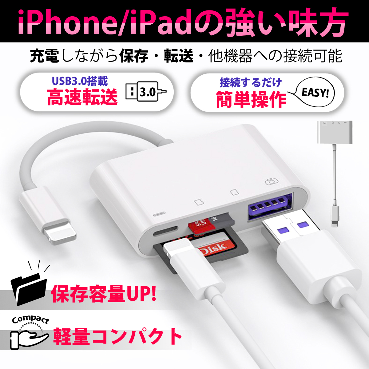 カードリーダー iphone usb3.0 sd lightning cf 保存 バックアップ ipad 4in1 microSD データ転送 写真 動画