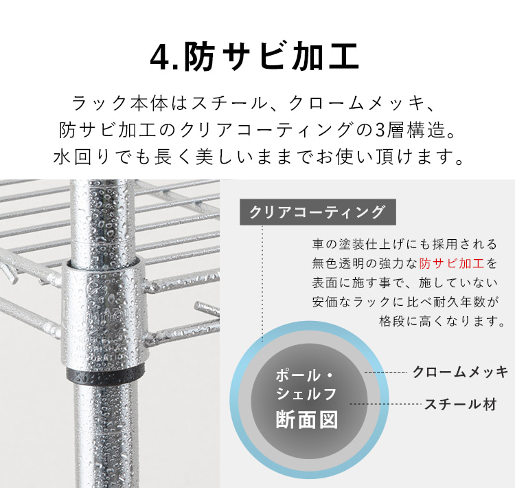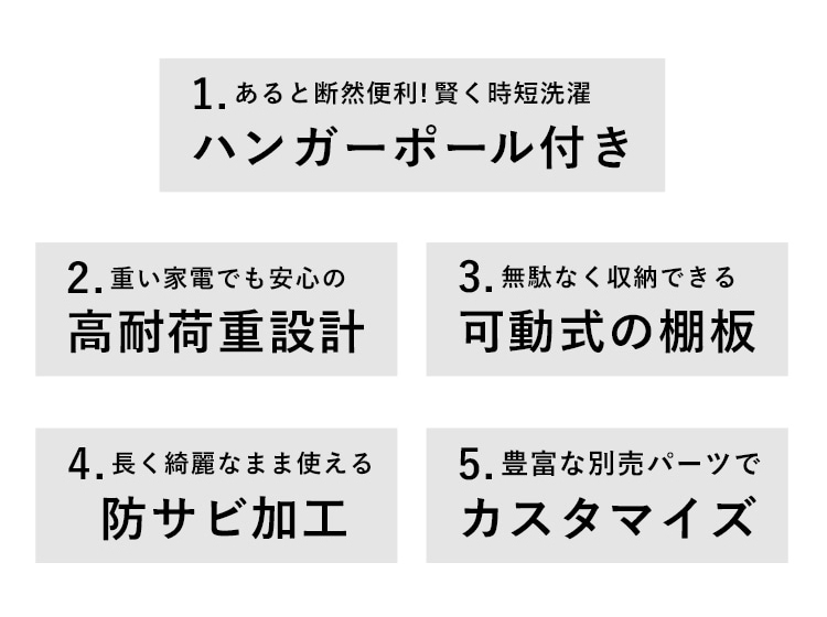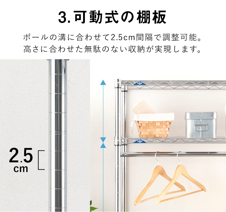 | 耐荷重(約) | 棚板1枚あたり…約135kg / ハンガーポール…約20kg / ラック全体…約270kg |