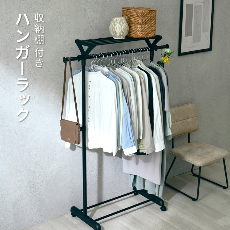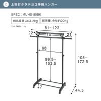ハンガー部分の両サイドに約20cm伸びる伸縮ポール、ハンガーポールの上部に耐荷重2kgの収納棚の収納スペースを設置。