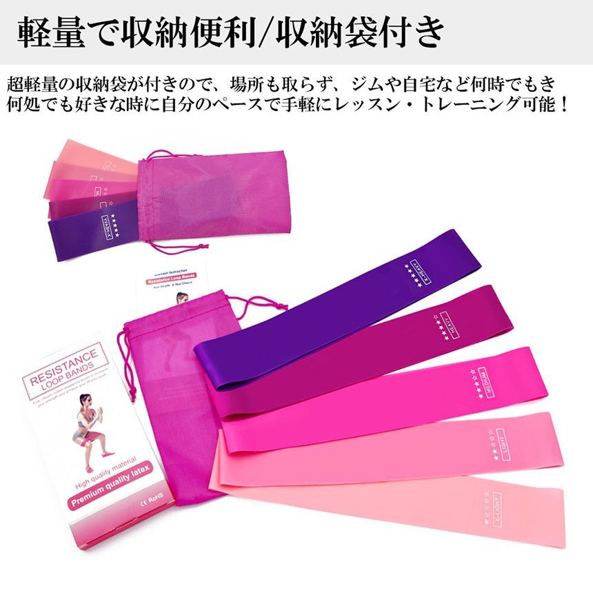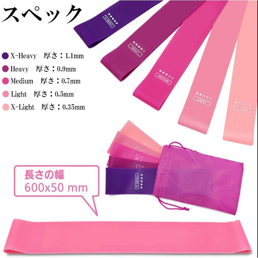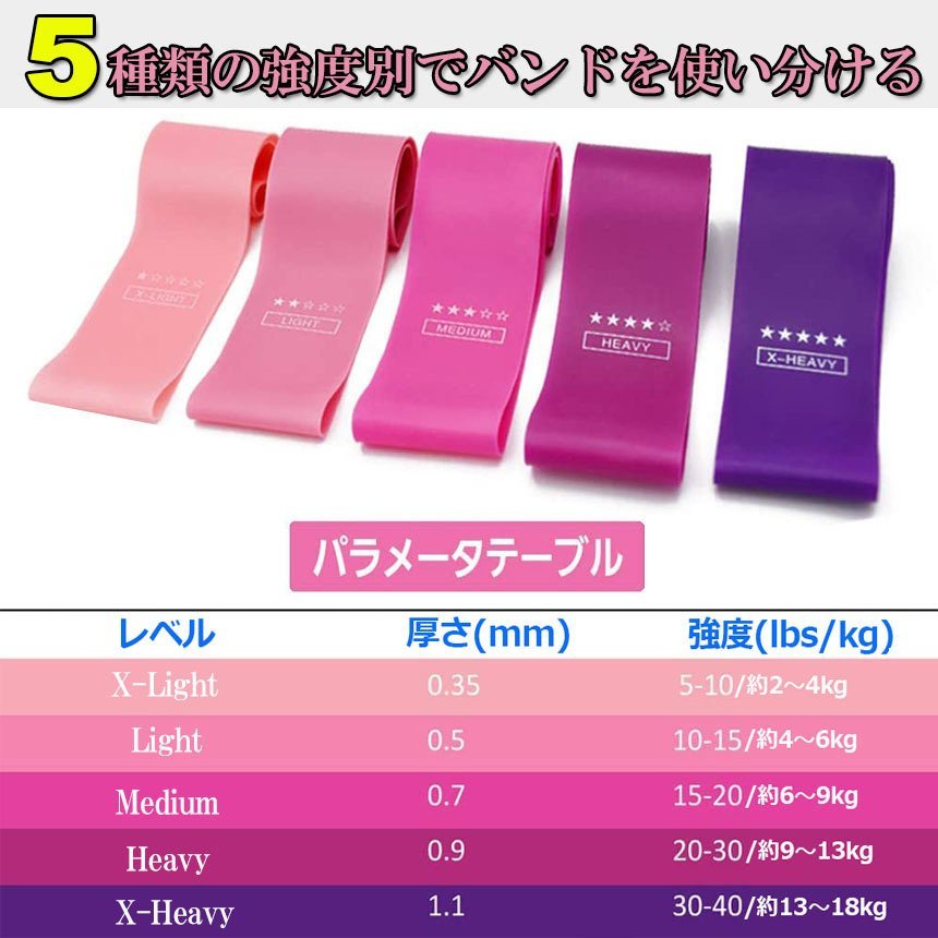【強度レベル5色セット】5色のエクササイズバンドはそれぞれの強度レベルも違います。身体の箇所や体調によって自由自在なトレーニングや筋力アップが可能です。