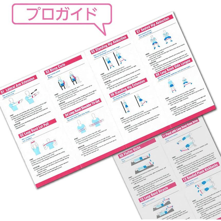 【全身筋トレーニング】トレーニングチューブはプロガイドが付き、足、腕、胸、腹、お尻などトレーニングの12種類練習図を示しています。