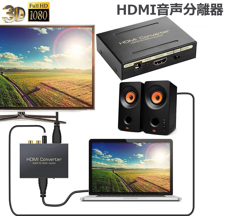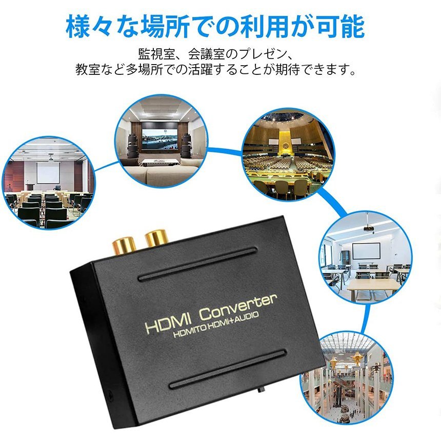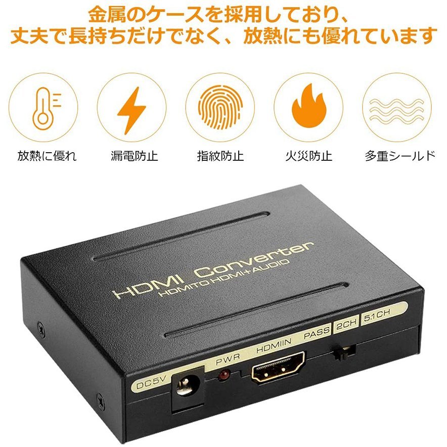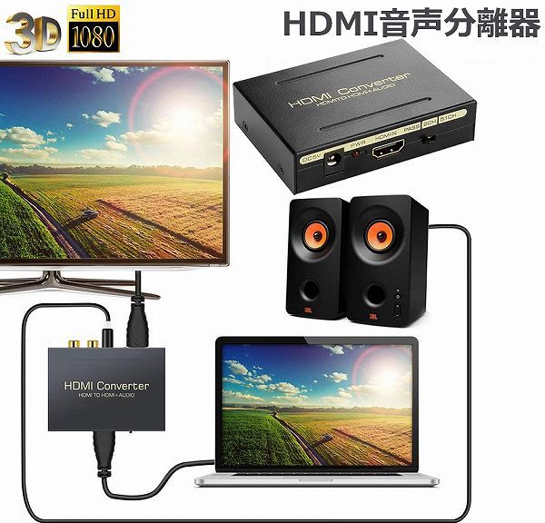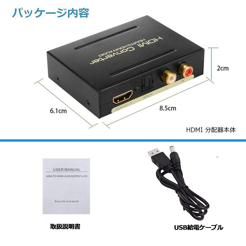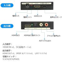 HDMIから入力して、映像をHDMIから出力、音声をSPDIFとRCAで出力します。音声と画面の分離が可能です。(5V1A/USB給電)