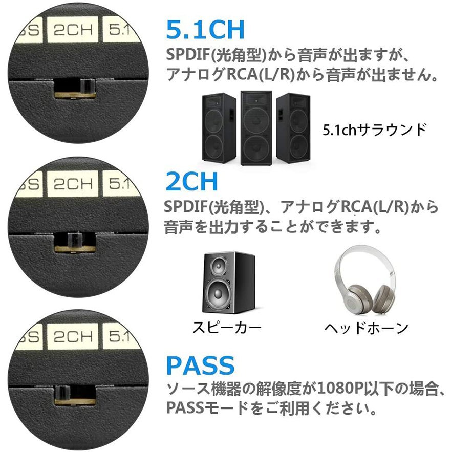 3つのオーディオモード:PASS、2CH、5.1CHです。PASS:ps4などのHDMI音声源を製品に経由してそのままHDMI信号を出力します。2CH:ご利用のモニター/アンプ/スピーカーが5.1CHに未対応だと、ソース機器の音声出力モードをPCM/LPCMにするのが必要です。製品の音声モードを2CH、PASSにすると、音声を出力することができます。5.1CH:ご利用のモニター/アンプ/スピーカーが5.1CHに対応できます。それにソース機器の音声源も5.1CHの場合、製品の音声モードを5.1CH、PASSにすると、音声を出力することができます。