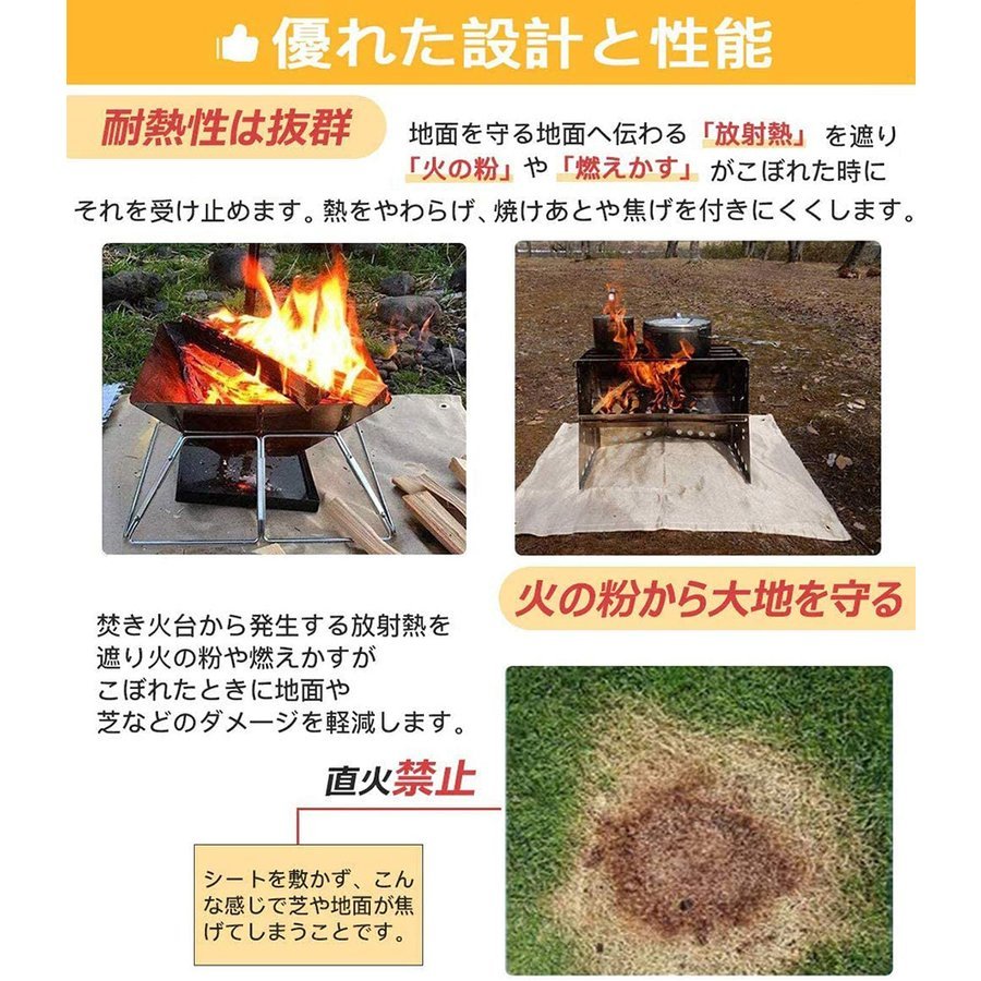 【キャンプやバーベキューの必需品ですよ】 野外キャンプでも,家の庭の芝生あるいは露台でバーベキューしても,焚き火シートはなくてはならないですよ。それをだき火の下に置いて、熱い木炭や火のついた薪が落ちても、全く燃えません。