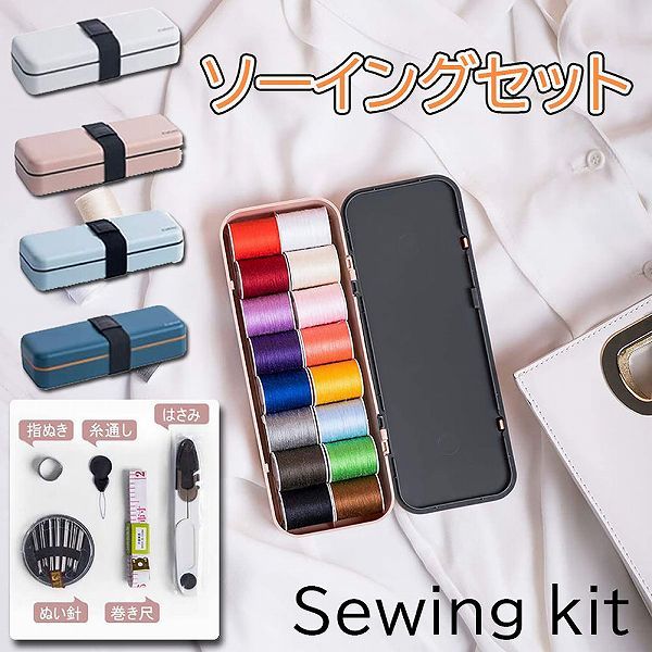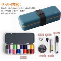 【セット内容】収納ボックス*1、抜糸器*1、はさみ*1、糸通し*1、ぬい針ケース*1(ぬい針30個)、ピンセット*1、縫い糸*16色、巻き尺*1、指ぬき*1、ぬい針ケース*1