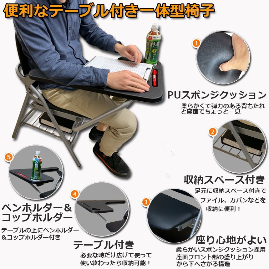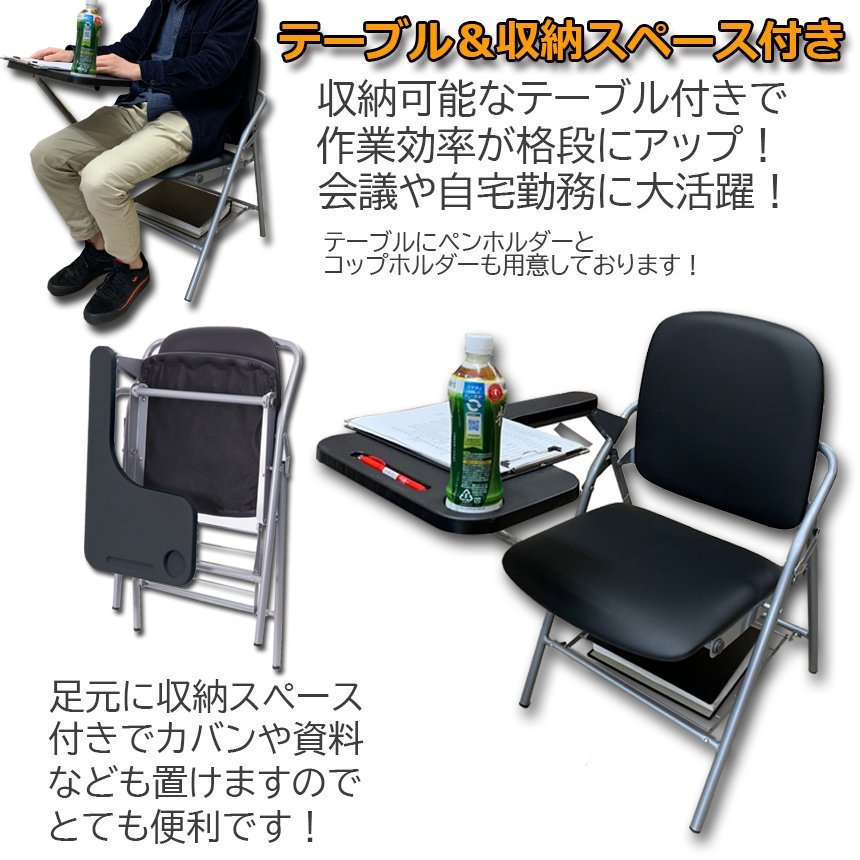 【テーブル&収納スペース付き】テーブルつきで集会や会議で使える多機能装備。会社や学校などでの講習会、在宅勤務などで便利に使用。テーブルの上にペンが転んで落ちないようにペンホルダーを設置し更にコップホルダーもご用意しております。