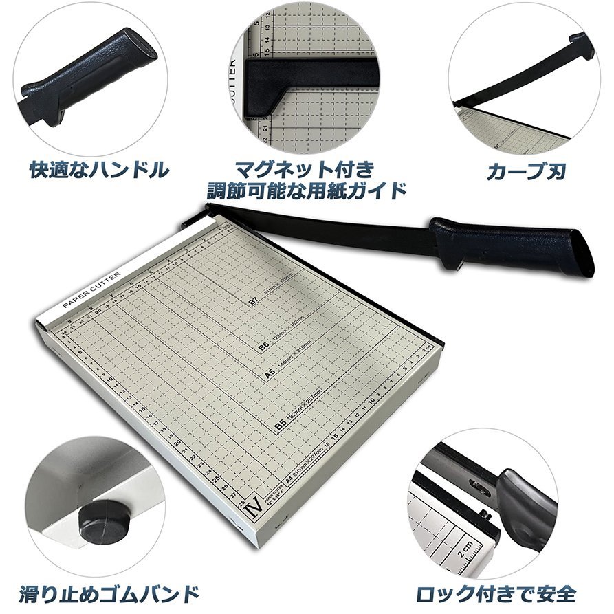 【鋭利な刃】ペーパーカッターは非常に鋭利なスチールブレードを備えており、紙の束を簡単にカットできます。印刷用紙、写真用紙、カード用紙、薄いコート紙などの一般的な用紙は簡単にカットできます。