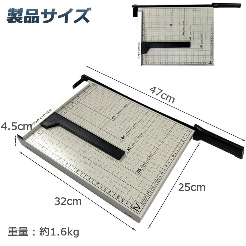 【製品仕様】製品サイズ:470X250X45mm、重量:1.6Kg、切断可能サイズ:300X250mm、ペーパーカッターの適用可能な切断範囲:A4、A5、B5、B6、B7