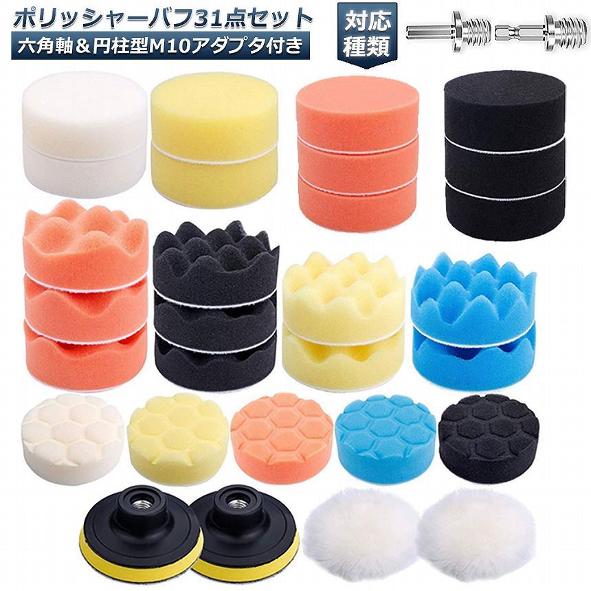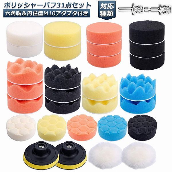 【31点セット内容】25枚8cm研磨スポンジパッド、2枚ウールパッド、2個ドリルアダプタ(六角軸付き)、2個吸着盤が含まれます。直径:8cm。