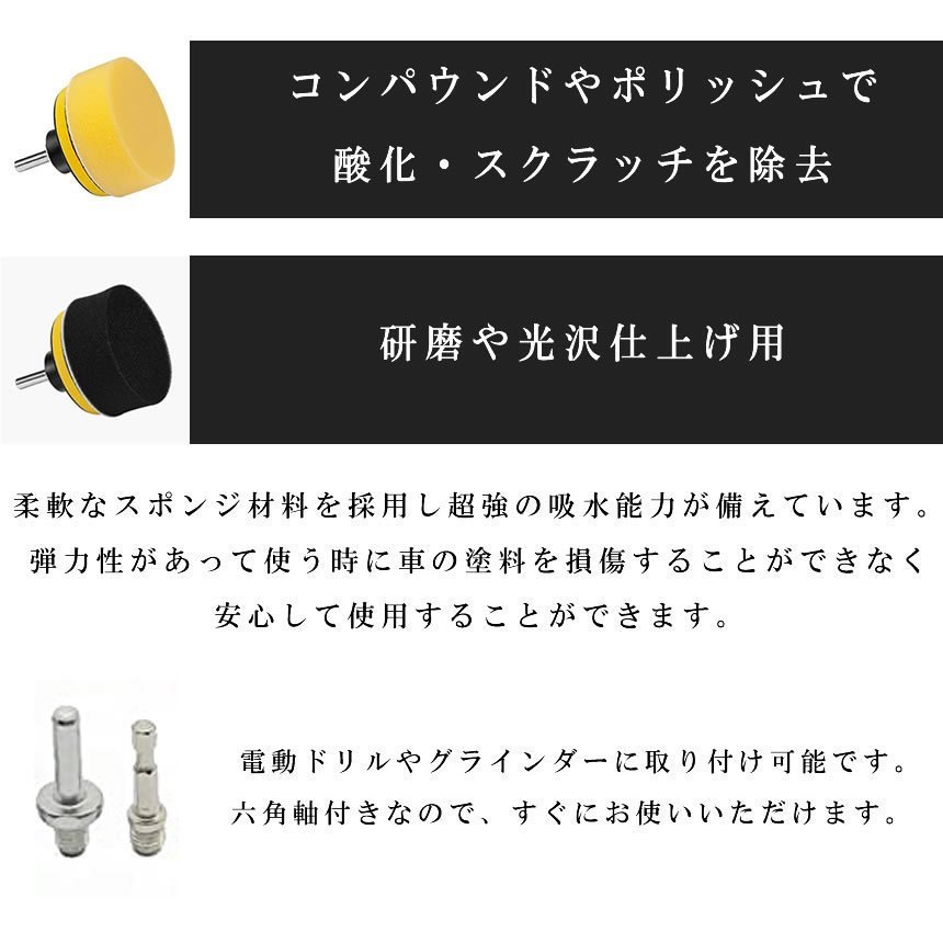 取り付け簡単、マジックテープ式で脱着する便利なポリッシャースポンジで、電動ドリルやグラインダーに取り付け可能です。六角軸付きなので、すぐにお使いいただけます。