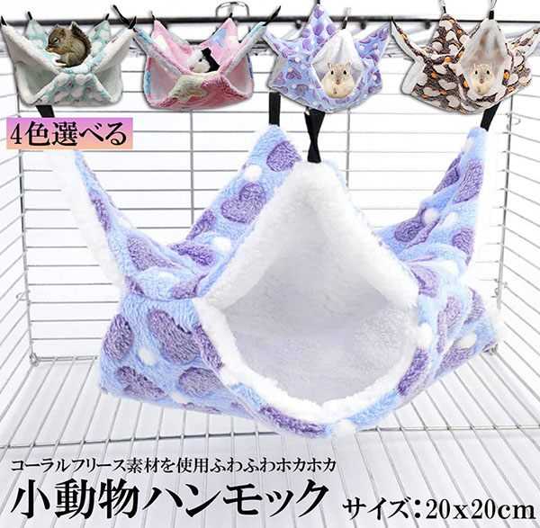 対象:ウサギ、フェレット、モルモット、チンチラ 小鳥など小動物。手触りの良いボアを採用し、ふわふわ暖かな感触。ハンモックにゆられてぬくぬく。
