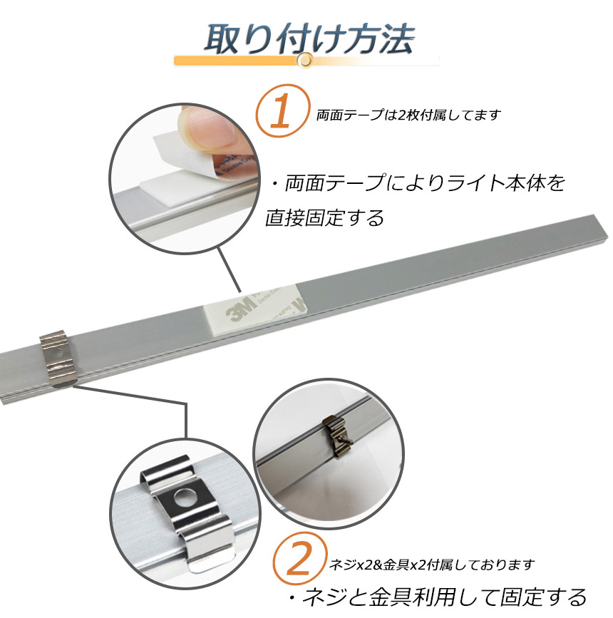 【強力両面テープ/ネジ付き】取り付けには両面テープやネジ提供します、金属、プラスチック、材木、ガラスなどいろんな場所にぴったり吸着することができます。好きな場所にバーライトを簡単に装着できます。