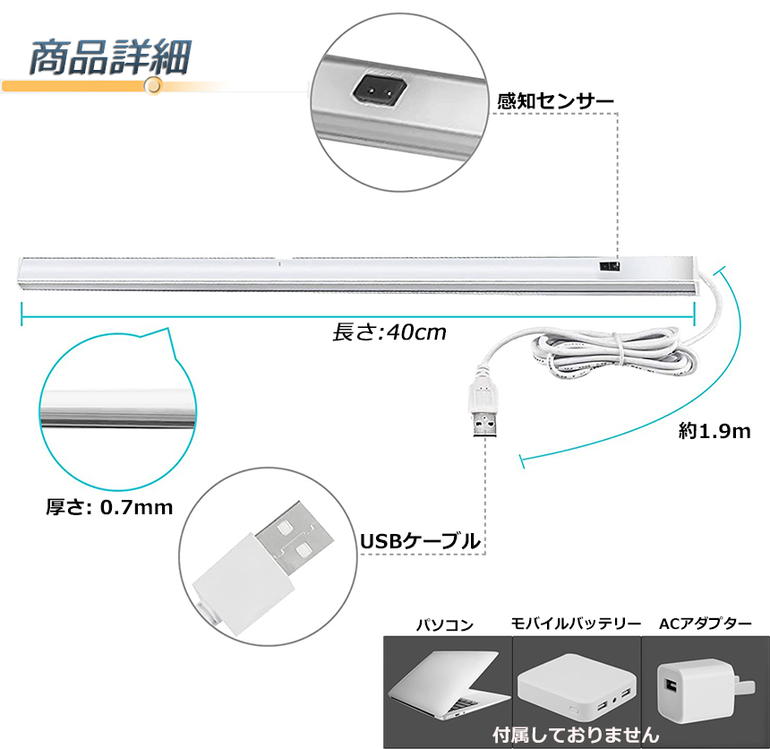 【濡れた手でもかざすだけ】 手をかざすとセンサーが感知し、点灯・消灯を切り換えできる。キッチン作業に欠かせない手元の明かりをサポート。調理中に手が濡れたり汚れたりしても点灯/消灯することをできます。清潔に使える。【超高輝度LED × 40CM 】3段階調光: 電球色、昼白色、昼光色、高品質のLEDは高輝度の照明を提供します。長さは40cmで、より広い照明範囲を提供します。