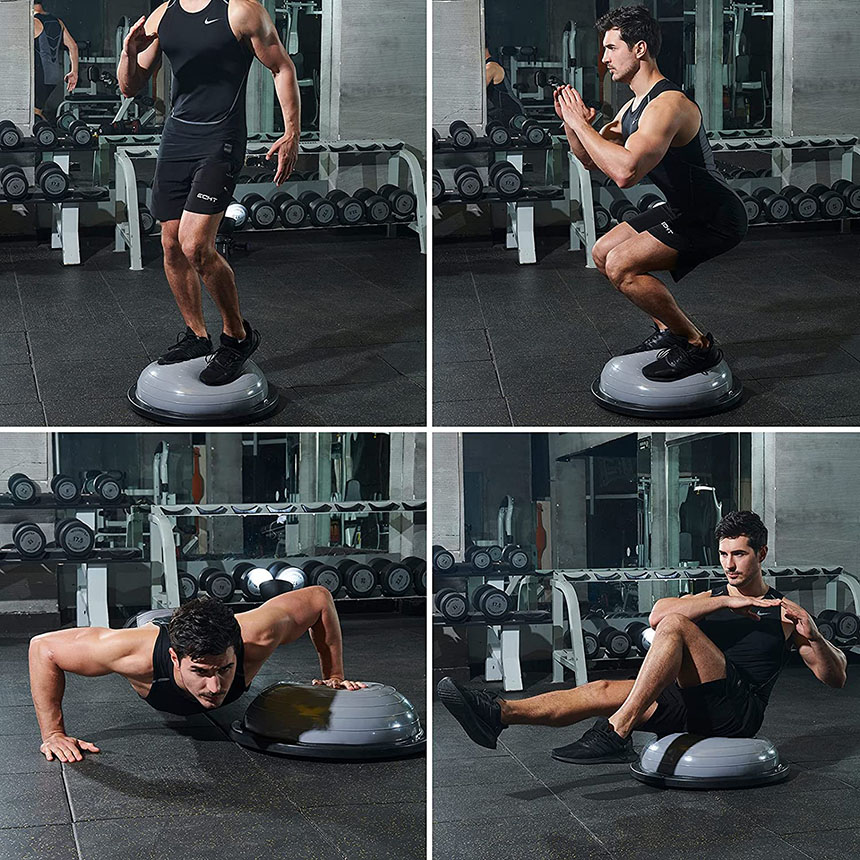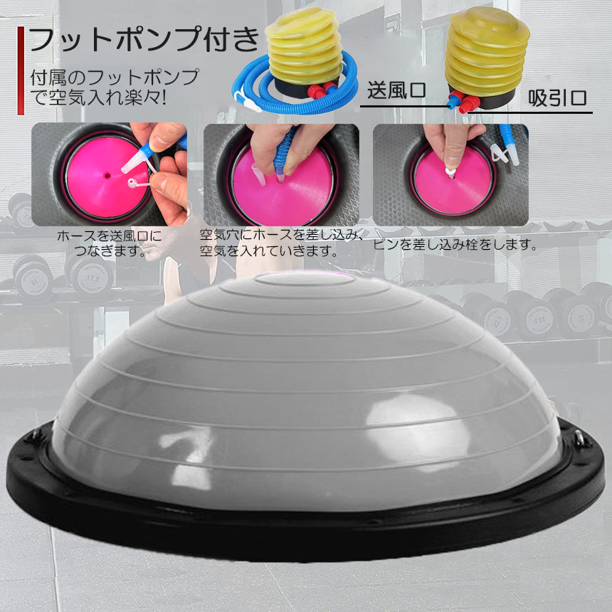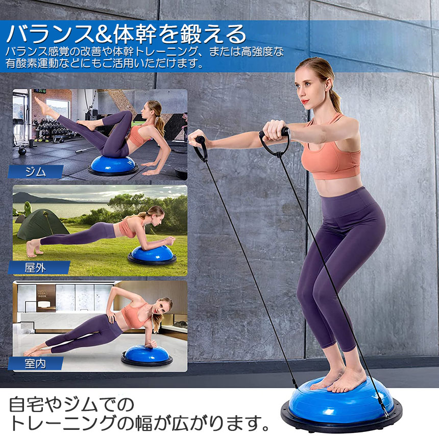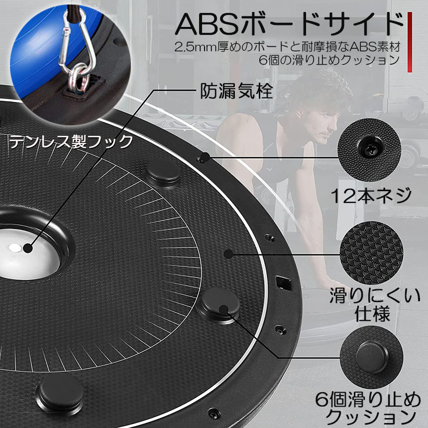 【素材】丈夫なABS素材の2.5mmボードサイド&6本ゴムの足座により、バランスドームが力を均等に負担し、安定のベースの内部が凹面デザインを採用し、踏み込むことによる不安定現象を避け、筋トレしっかりとしたサポート