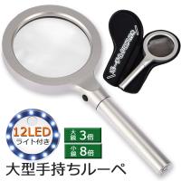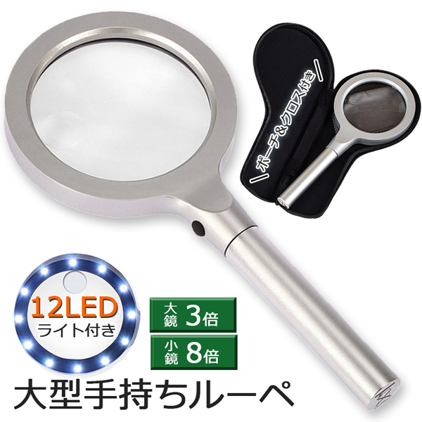 【LEDライト付き】手元が影になって見えない・暗い部屋で文字を読みたい…そんなお悩みを解決するLEDライト付き!スイッチを押すだけでライトのON/OFF、6光/12光の切り替えが行えます。【大きいから便利】大鏡の直径約8.5cmで広範囲を拡大できてストレスフリー!
