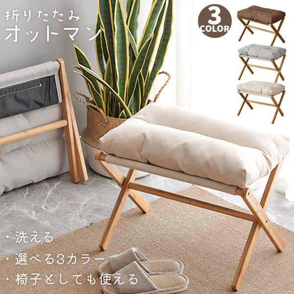 【足置き&椅子の便利なオットマン】座りっぱなしで負担をかけた足腰を癒したり、ちょっとくつろぎタイム、靴のぬぎ履き、椅子として等々、多方面で使える便利なオットマンです。【折りたためて持ち運び楽々】クッションを外してサッとっ畳める、簡単に折りたたんで収納できるデザインです。なので、使わないときはお部屋のスペースを取りません。持ち運びもしやすいのでいろんなところに持ち運んで使えます。