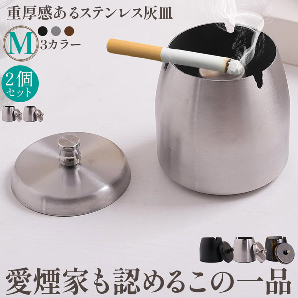 灰皿 蓋つき 3カラー Mサイズ 2個セット ステンレス ブラック シルバー ブラウン アンティーク マット 質感 耐久性 金属 アッシュトレイ おし