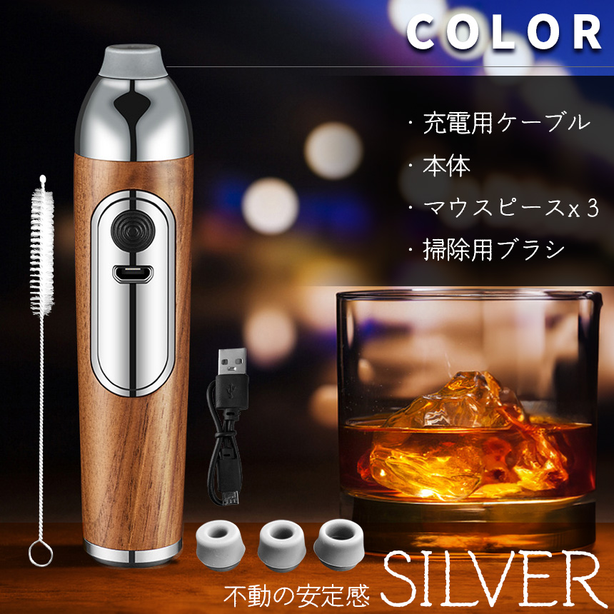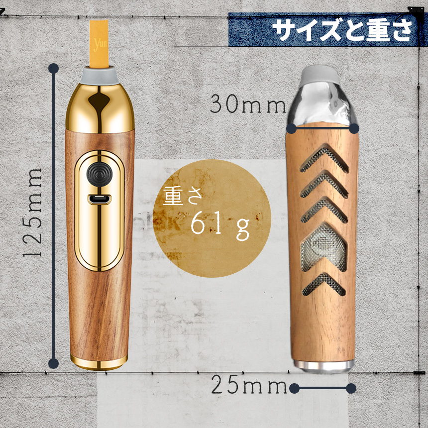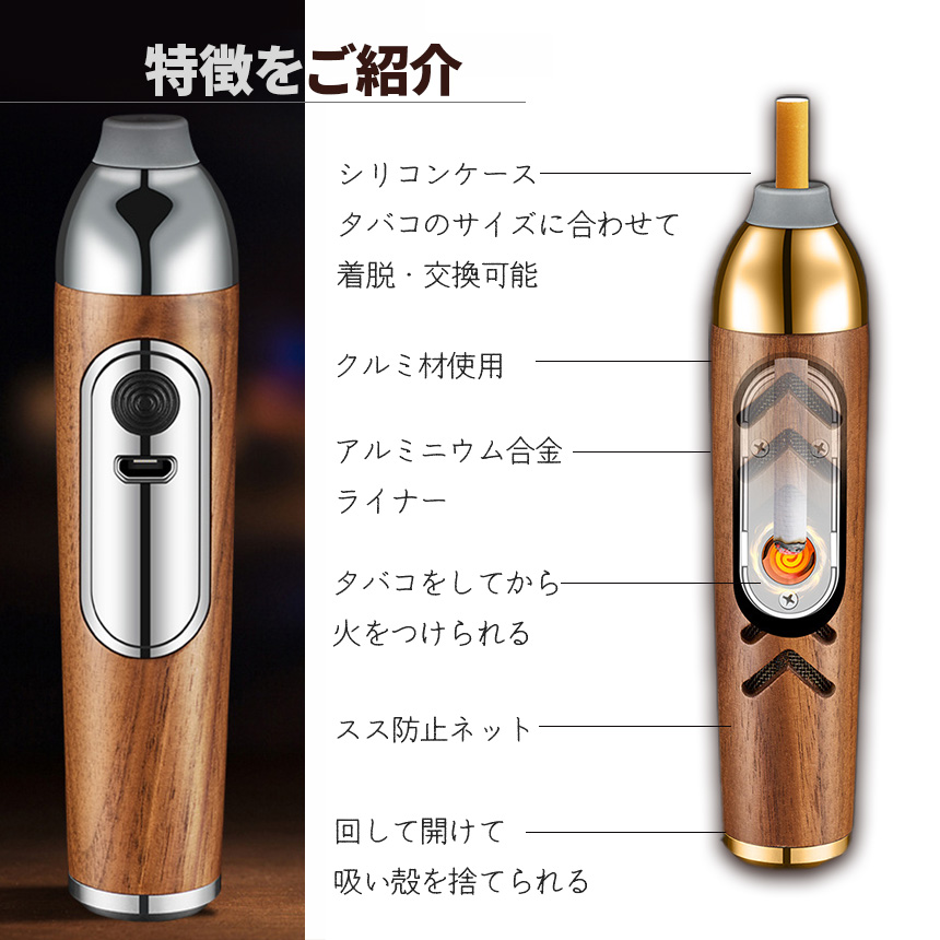 本体は高品質のくるみ木材採用。木の風合いもよくお洒落なデザイン性です。ブラウンの本体に、ゴールド、もしくはシルバーのパーツの2つの色合いからお選びいただけます。軽量な設計ですので、重くて吸いにくいといったことはありません。3種のシリコンホルダーもf03-27aになっていて、いろいろなサイズのたばこに適応出ます。(自然の木ですので、個体差があり色合いが異なります。)