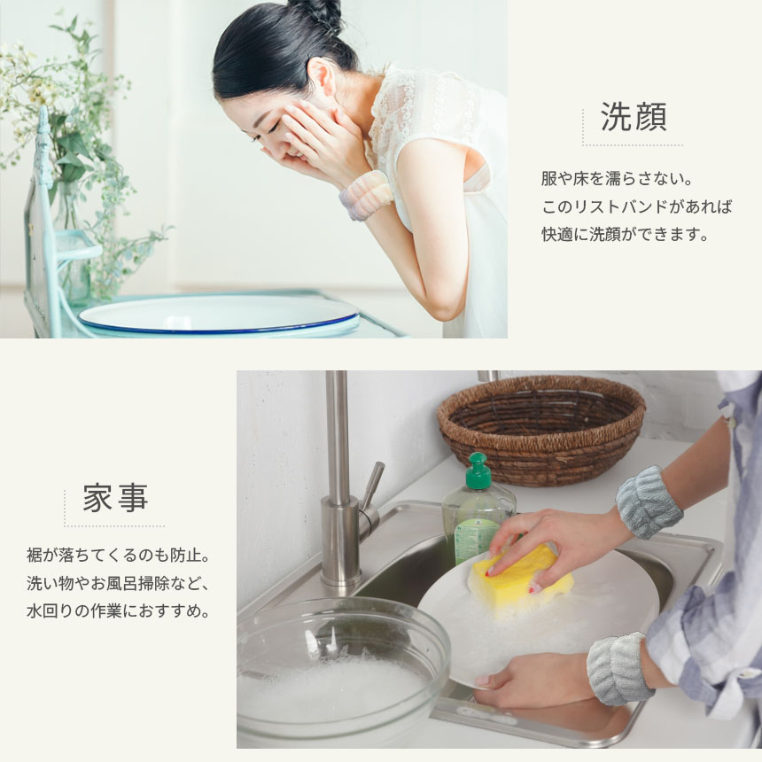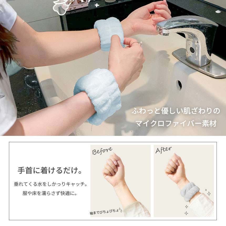 【吸水リストバンド】手首に着けるだけ!垂れてくる水をしっかり吸水するリストバンドです。日々の洗顔や手洗い、洗い物などの際に水が腕を伝って垂れてきて袖口や床まで濡れた経験はありませんか?そんなお悩みを解決し、いつもの生活をちょっと便利にするお助けアイテムです。