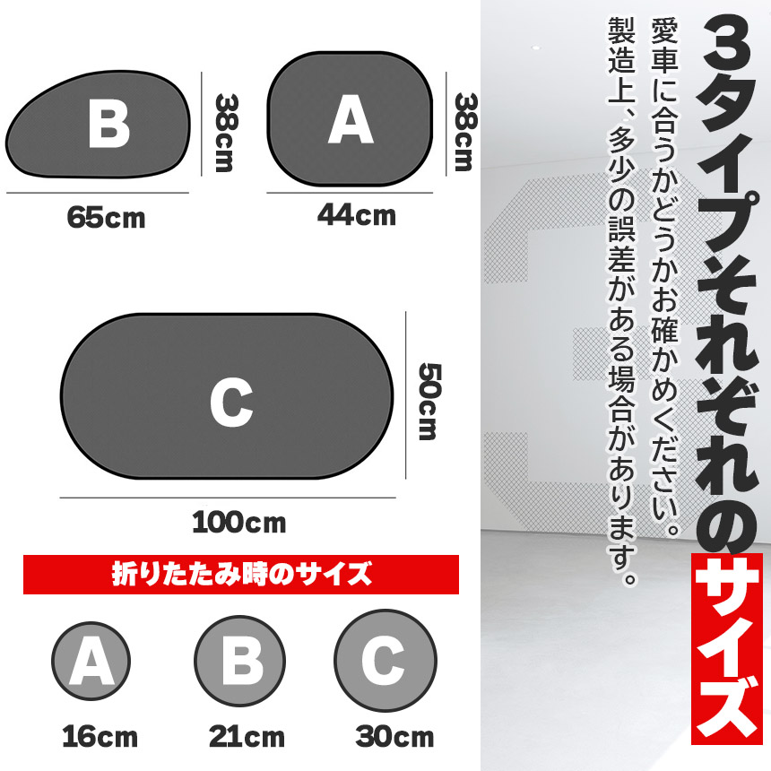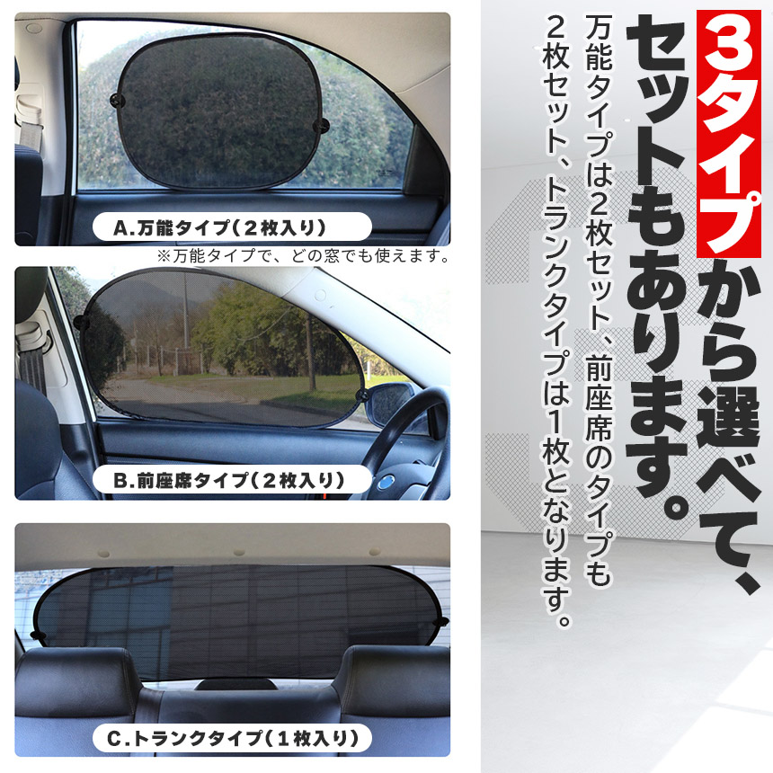 A.万能タイプ(2枚入り)、B.前座席タイプ(2枚入り)、C.トランクタイプ(1枚入り)の3種類!A.B.C共、4つ吸盤入りです。