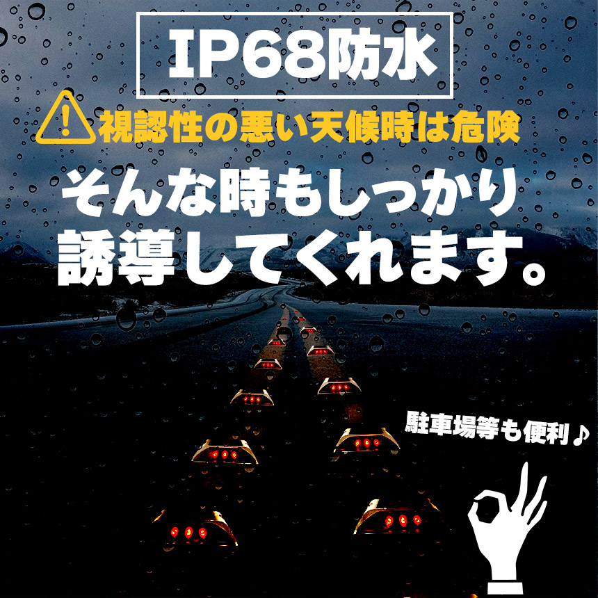 IP68の防水性能があり視界の悪い悪天候時も使えて、安全を確保!駐車場の白線が見えにくい、消えかけている、縁石の有無がわかりにくい等でもしっかり目印となってくれます。