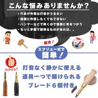 穴をあけたい場所に当てて、上からおさえるとスクリュー式に回転して穴をあけられる仕組みとなっています。上からハンマーでたたいたりするものと違い静かに開けることができ、環境を気にせず使用できます。穴寸法は6種類あります。6つの丸型穴(1.5mm、2mm、2.5mm、3mm、3.5mm、4mm)です。