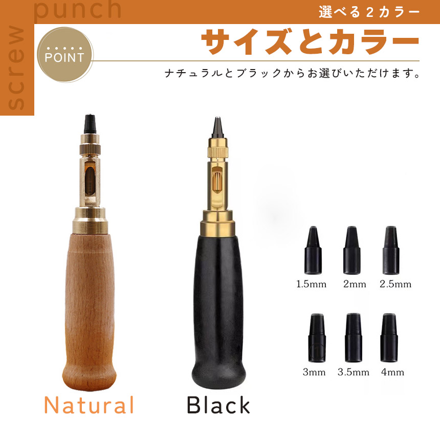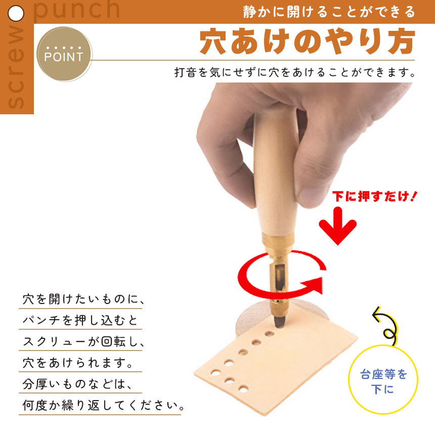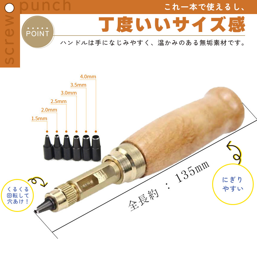 【スクリュー式穴開けパンチ】握りやすいデザイン、温かみのある無垢材、回転式で静かに打音なく開けられる便利で安心な穴あけパンチです。ベルトを穴開ける時に、力があまり使わなく、女性でも気楽に使用できる便利グッズです。