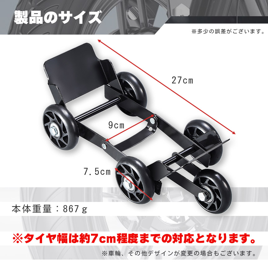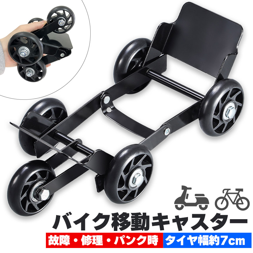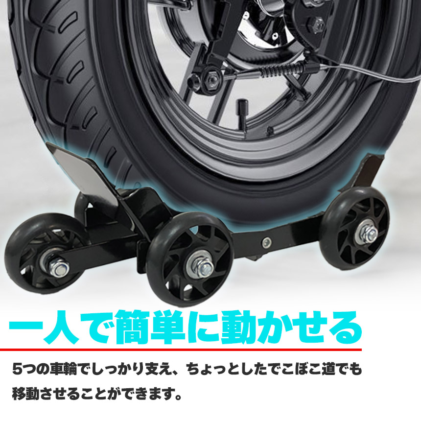 ●コンパクトで便利なバイクムーバー●バイクや自転車に!※タイヤ幅約7cmまでに対応【故障修理時の移動に便利!】故障時などでエンジンが付かないとき、パンク等トラブル時の移動時に補助してくれる移動ツールです。動かすのはかなり負担になったりタイヤを痛めますが、そんなときの手助けになります。