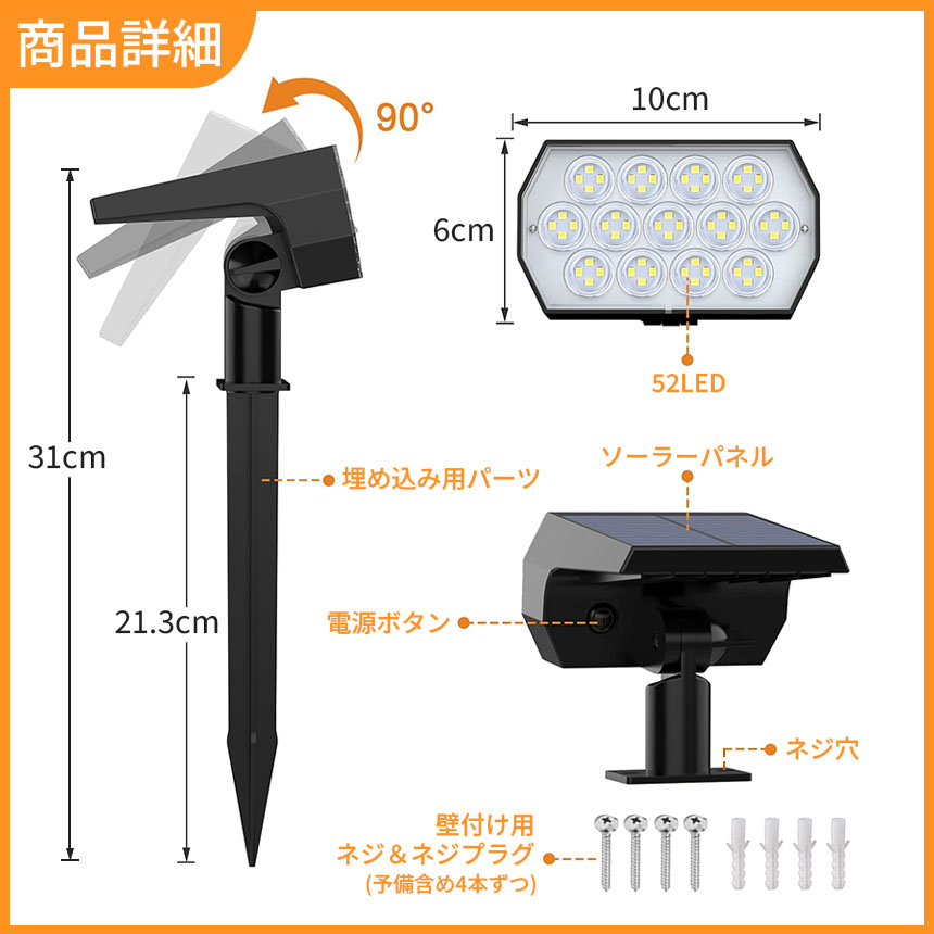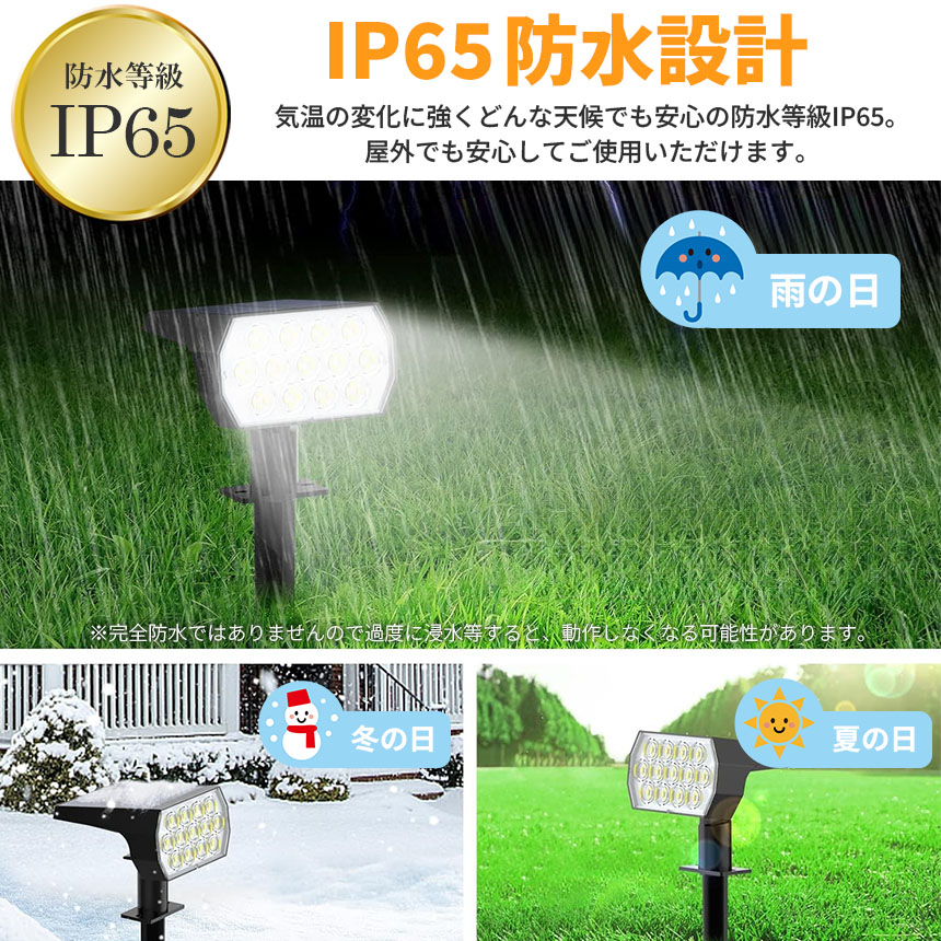 【光センサーで自動点灯】ソーラーパネルに明るさを感知するセンサーが内臓されているので、明るい場所ではソーラー充電し、暗いところでは自動で点灯します。配線や電池が不要なので電気代0円で使用できます。【IP65防水】気温の変化に強くどんな天候でも安心して使用可能な防水等級IP65の製品です。屋外での使用にぴったりです。※完全防水ではありませんので過度な浸水などの被害で動作しなくなる可能性があります。