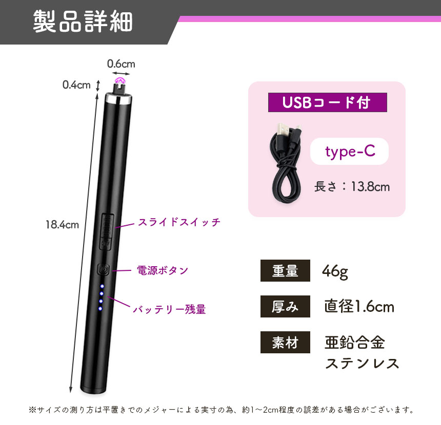 【サイズ】本体:縦18.4cm(点火部分をしまった状態)×横1.6cm×厚み直径1.6cm