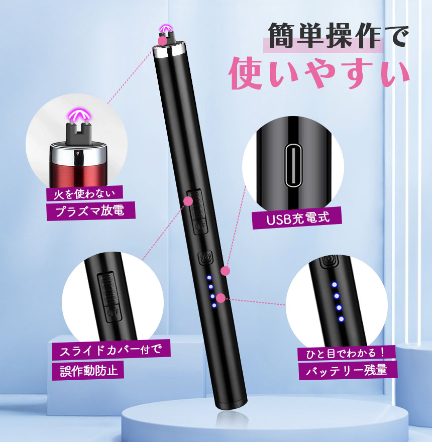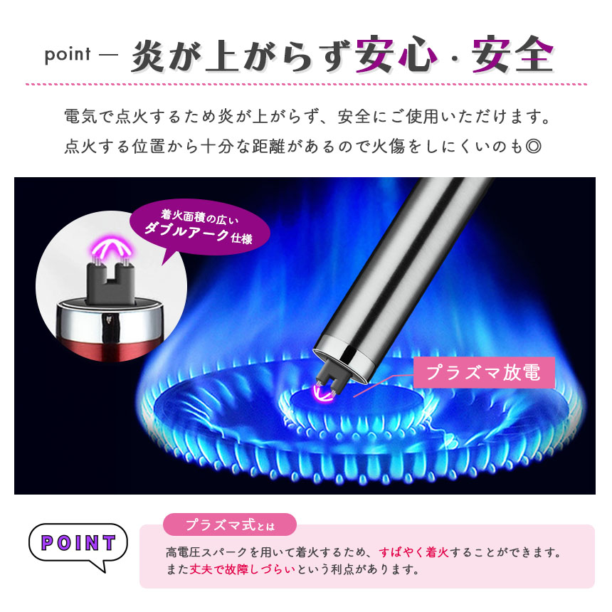 ●ガス・オイル交換不要! ダブルアーク仕様電子ライター●まだライターを使って火をつけていますか?ガス・オイルの交換不要、風に強い、安全なライターがあります。point【炎が上がらず安心・安全】電気で点火するため炎が上がらず、安全にご使用いただけます。点火する位置から十分な距離があるので火傷をしにくいのも◎また着火面積の広いダブルアーク仕様のプラズマ放電を採用しています。