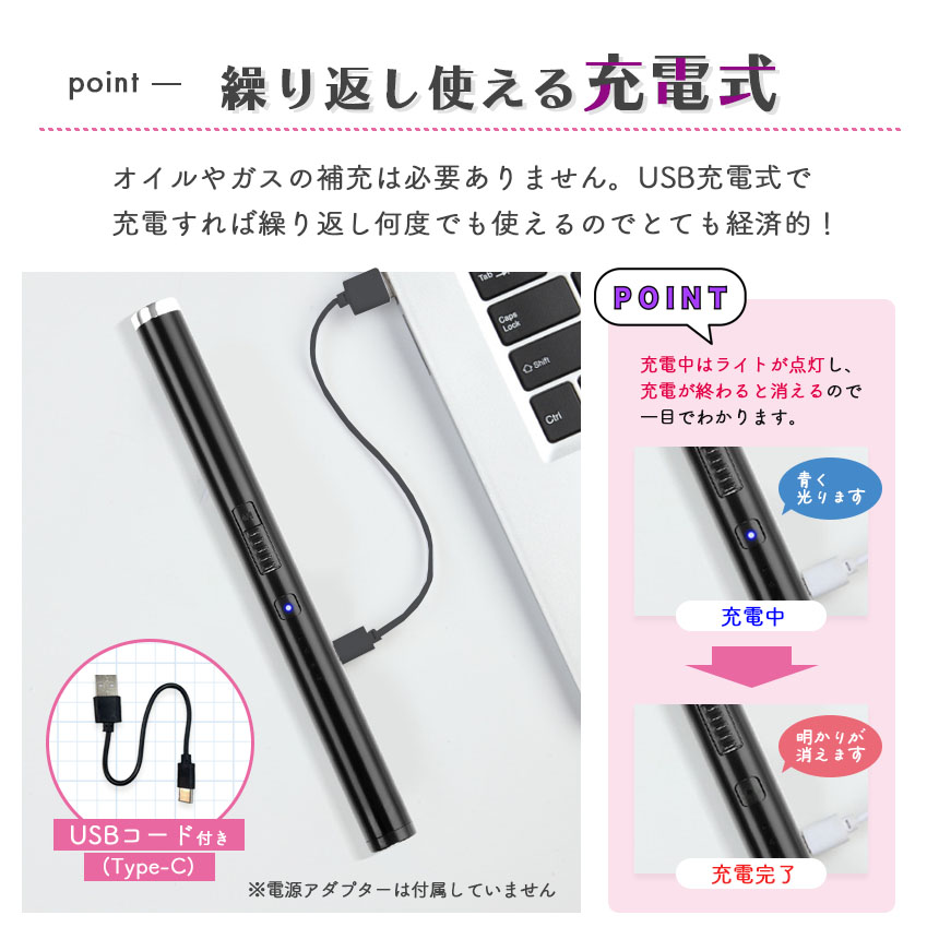 オイルやガスの補充は必要ありません。USB充電式で
