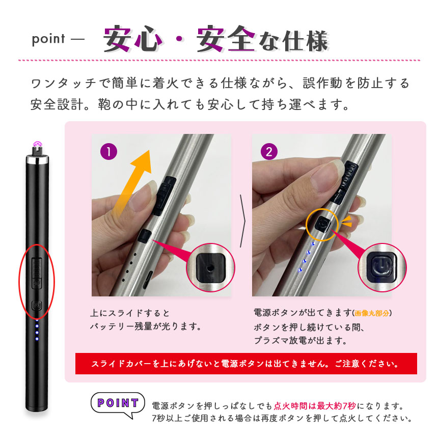※電源ボタンを押しっぱなしでも点火時間は最大約7秒になります。
