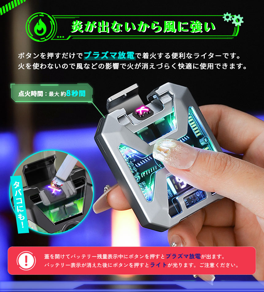 ※蓋を開けてバッテリー残量表示中にボタンを押すとプラズマ放電が出ます。