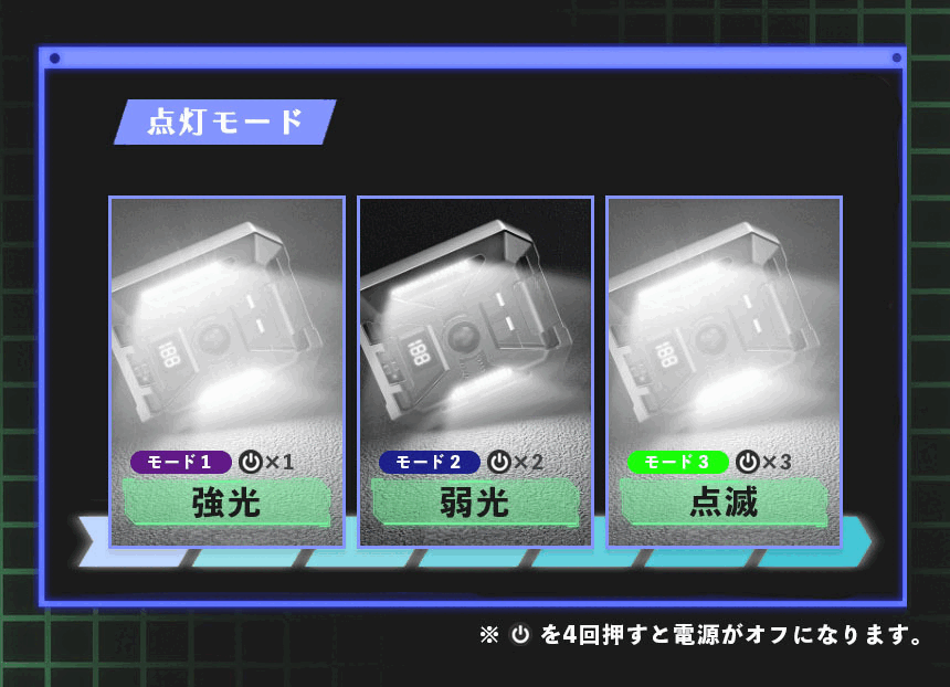 強光→弱光→点滅の順に3つのモード変更が出来ます。